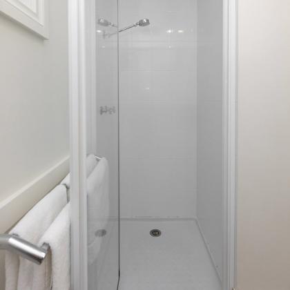 The bathroom features a walk-in shower and toilet, while the main bedroom at the end of the hall has a queen bed.