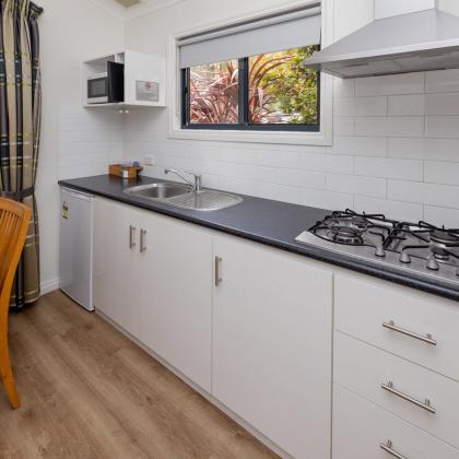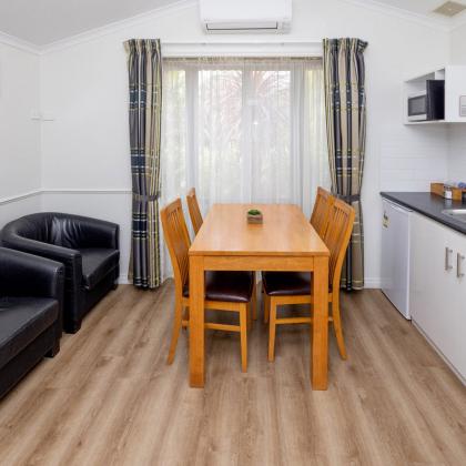 Nestled in stunning natural gardens, these chalets suit couples or small families. Inside, you'll find a main living area with a wall-mounted TV/DVD, two leather armchairs, a four-seat dining table, and a kitchen equipped with a bar fridge, microwave, and two-burner induction cooktop.